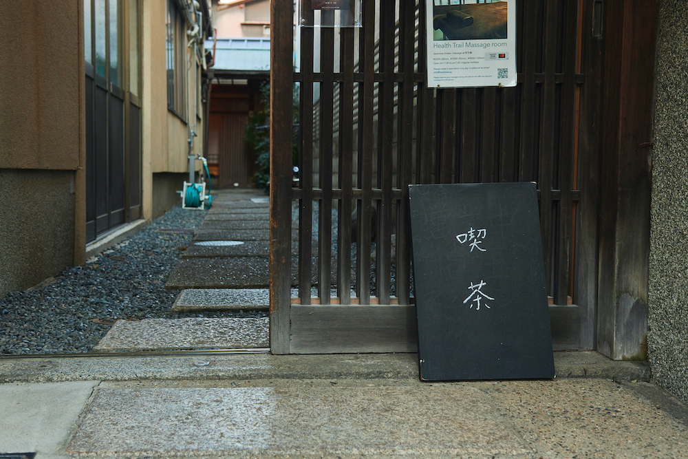 控えめな看板が、ここで喫茶ができることを教えてくれます。地下鉄の今出川駅と丸太町駅のどちらからも徒歩15分圏内ながら、知る人ぞ知るお店。