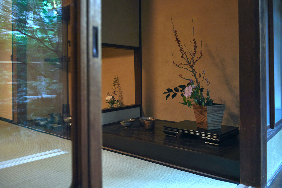 京都を隅々まで知り尽くす散歩の達人から教えてもらった「好文舎(こうぶんしゃ)」は、御所の蛤御門から歩いて8分の場所にある隠れ家的なギャラリーカフェ。古民家に溶け込むように展示された若手作家の作品や、店主の趣味で集められた古道具、山野を切り取ったように飾られる和花たちが静謐な空気を醸し出します。