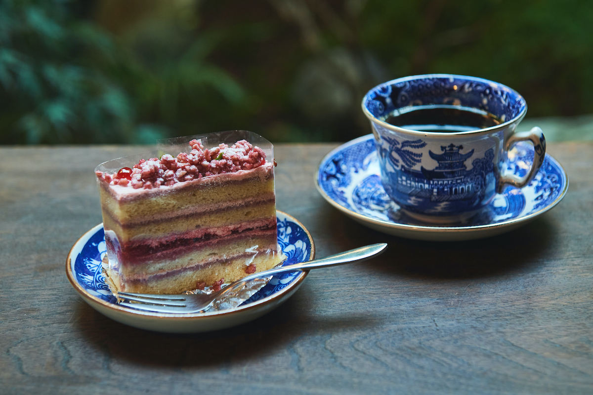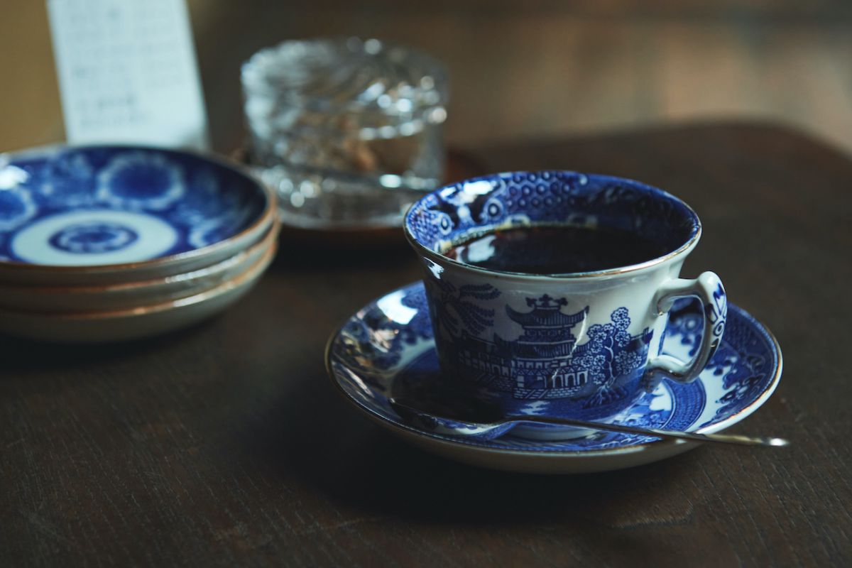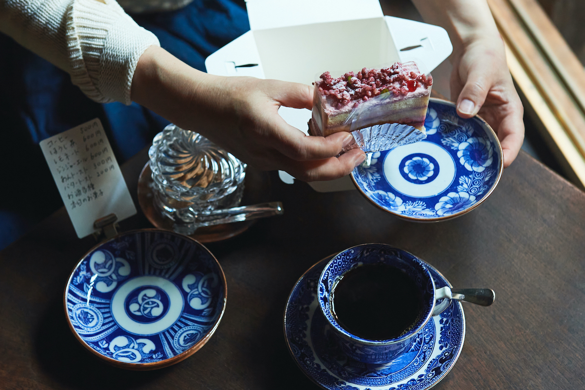 骨董のお皿は洋菓子とも相性抜群。店主とも交友があり、ご近所でも評判のお菓子をおいしいコーヒーと一緒にいただける素敵な空間。新進気鋭の作家の作品と思いがけない出合いもお楽しみに。
