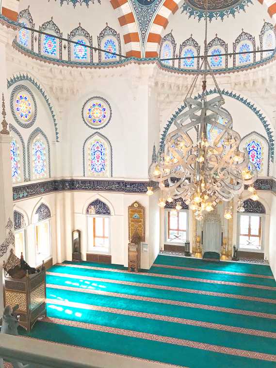 イスラム教では、男女別々に礼拝することが定められているので、礼拝堂の2階には女性しか入れない礼拝スペースも。2階に上がると天井が近くなり、ステンドガラスが間近で見られるので迫力満点!ステンドガラスに描かれているのは、植物模様と幾何学模様が合わさったトルコの伝統的な模様なんだそう。
