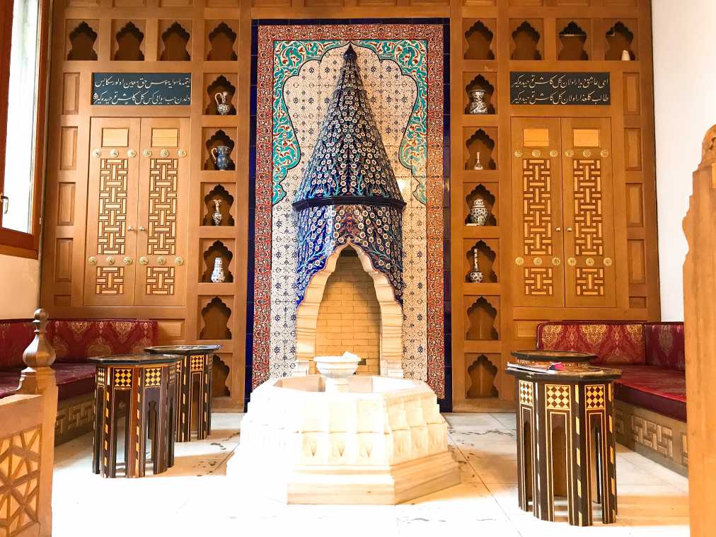 中に入ると、トルコ民家の応接間を再現しているスペースが。奥にあるのは暖炉で、繊細な手描きのタイルで作られています。いろいろな色や柄が混在しているのに、ごちゃごちゃして見えない絶妙なバランス感覚は、古くから続くトルコ独特のデザイン文化から生み出されていて、日本では見られない美を感じます!