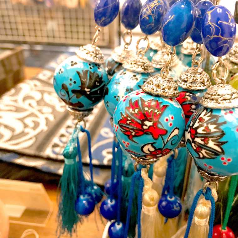 1階にはトルコ製のおみやげを購入できるスペースも完備。鮮やかなキーホルダーや、ストーンの付いたスプーンなど、思わず「かわいい〜!」と声が出てしまいました。隅々まで見逃せない、トルコ職人の技が光る「文化」を感じてみてはいかがでしょうか?