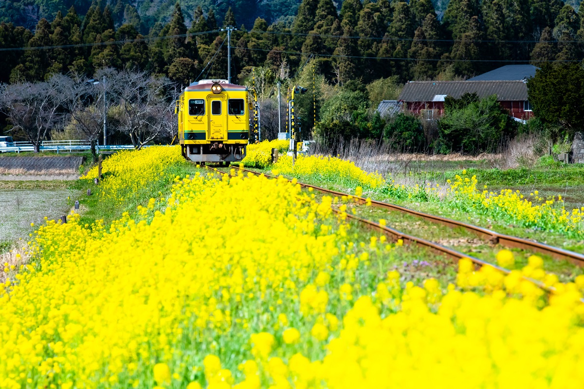 ひと足早く春が訪れるのも大多喜町の魅力のひとつ!2月下旬~4月上旬にかけて、菜の花が見頃を迎えます。黄色い菜の花の中を走るいすみ鉄道はこれからの季節にぜひ訪れたいですね!