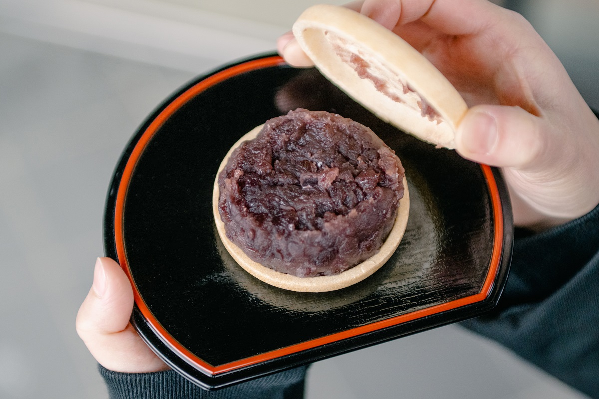 北海道産の小豆を使用した甘さ控えめのつぶし餡に、国産のもち米を使用した皮。どちらも添加物不使用です。そして、皮には初代大多喜城主・本多家の家紋「立葵」と、元禄16年(1703)から9代続けて城主となった松平家の「三ツ扇」がデザインされています。そんな歴史の深さも噛み締めつつ頬張る最中は、天下一品のおいしさです。