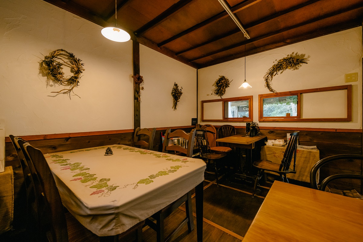 古い木材に蔦の葉っぱ。絵本の1ページのような雰囲気漂う築100年の古民家カフェ「珈琲 抱/HUG(こーひー はぐ)」さんに来ました。こちらは店主の水野さんが大多喜町に移り住んだ当初、裸電球ひとつに窓もなく地面は土だけ、というただの納屋だったそうです。そんな納屋を、地元のモザイクアーティストの方が一から改装し、水野さんとともに今の姿に仕上げたそうです。なんとも素敵すぎるお話。
