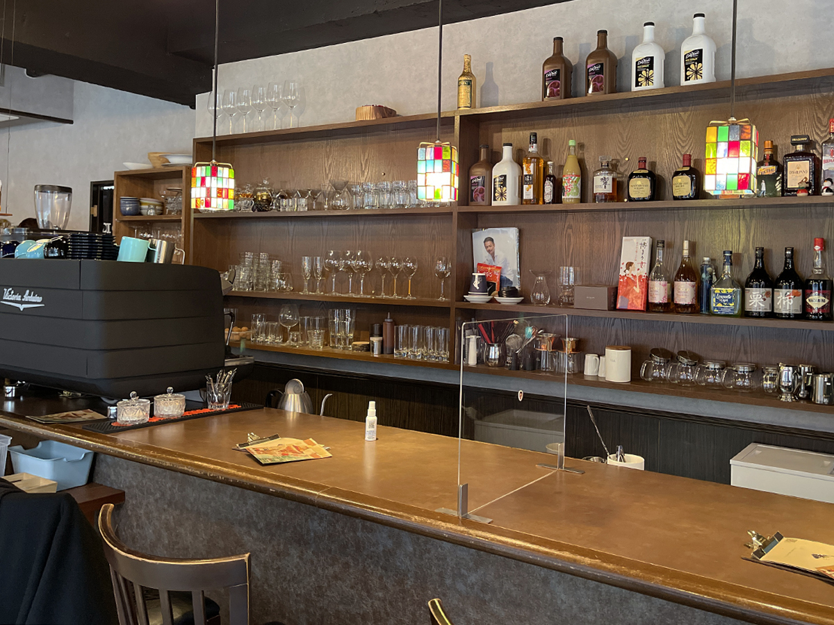 珈琲の香りが漂う店内。カウンターの棚にはお酒が並んでいます。