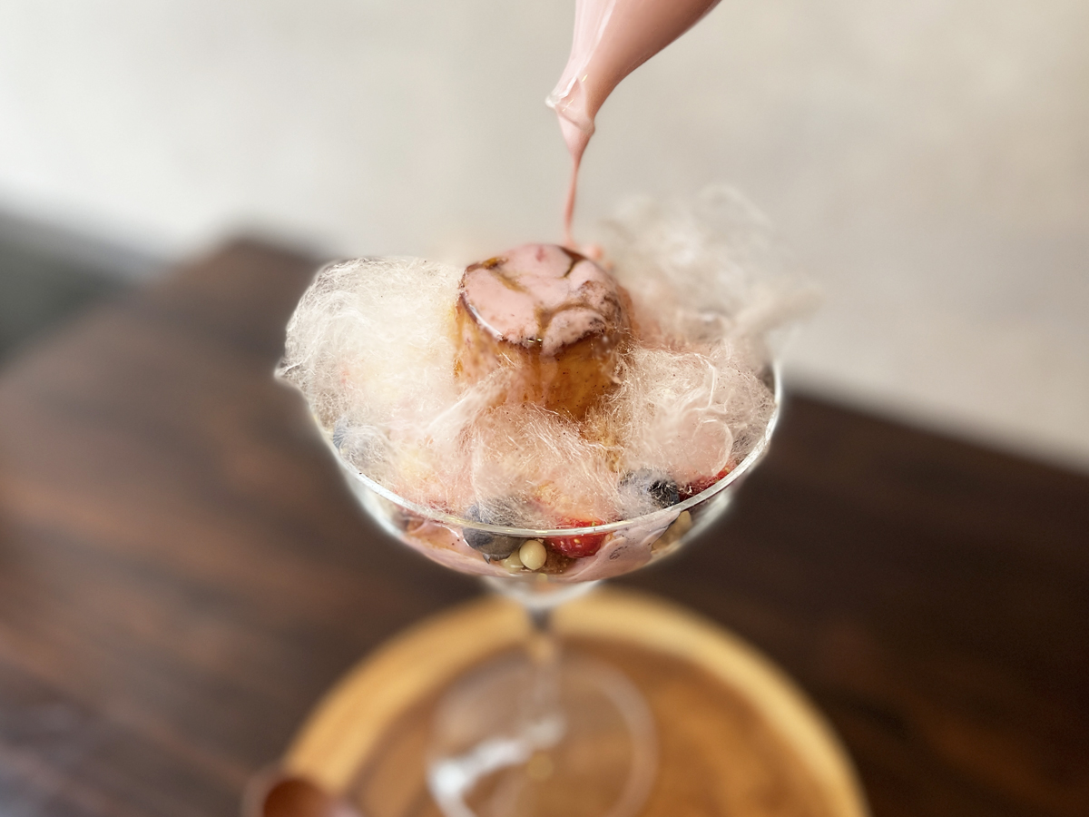 綿あめを半分ぐらい食べたところで、いちごミルクのソースをかければたちまちショートケーキ風パフェに味変♪ ほろ苦〜いプリンの濃いカラメルとも相性ぴったり。