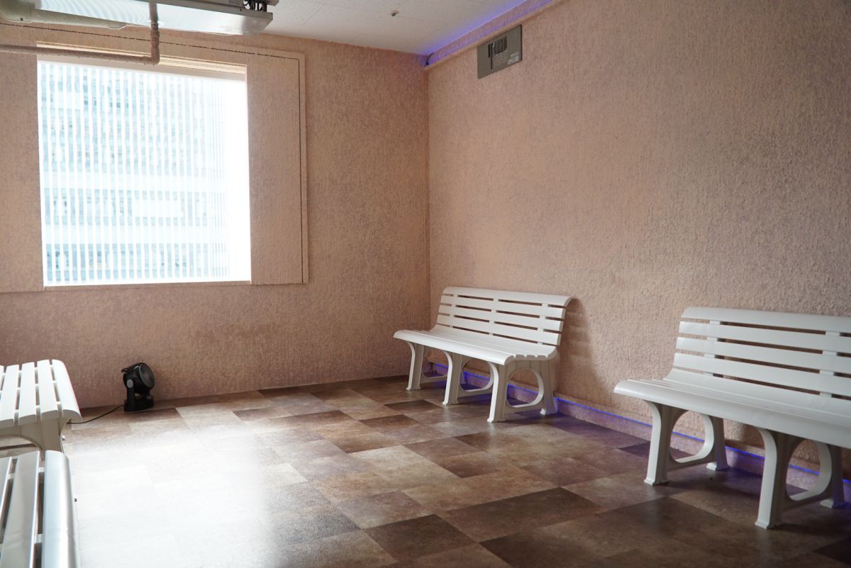 室内の壁一面にはヒマラヤ岩塩が吹き付けられており、空気を清浄してくれる効果があるのだそう。冷気がとっても心地いい空間です。大きな窓があり開放感があるのもポイント。汗をしっかり拭いてから入りましょう。
