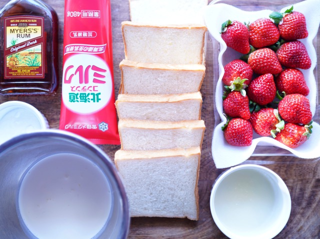 | 粉ゼラチン…3g 水…10g 8枚切り食パン…4枚 いちご(あまおう)…1パック 生クリーム…1パック グラニュー糖…10g コンデンスミルク…40g ラム酒…小さじ1 |