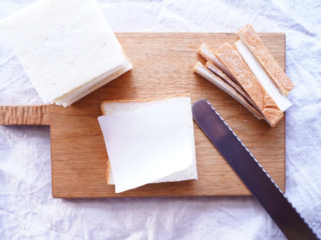 食パンの耳をカットします。写真のように、正方形に切ったクッキングシート等を目安にして、なるべく正方形にカットすると仕上がりがきれいです。