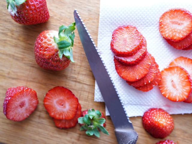 いちごは優しく水で洗い、キッチンペーパーで水気をふき取ります。