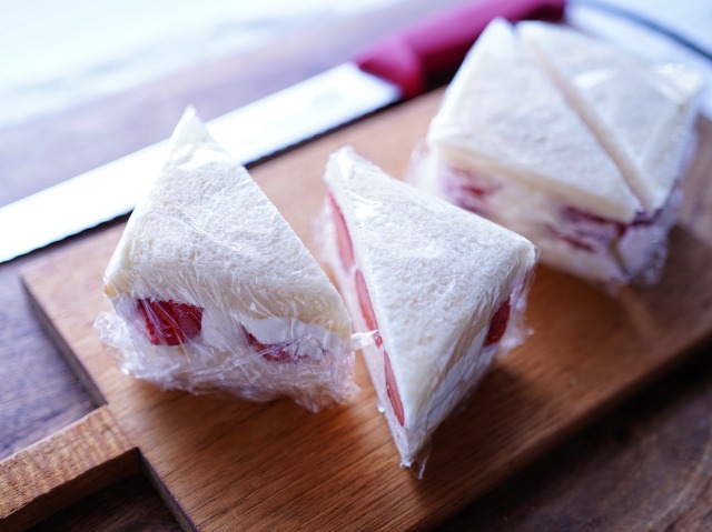 シンプルな材料で作るからこそ、パン生地がものを言います。今回はいちごサンドのためにミルク食パンを焼きましたが、ぜひパン屋さんの食パンを8枚切りにしてもらって使ってみてください。