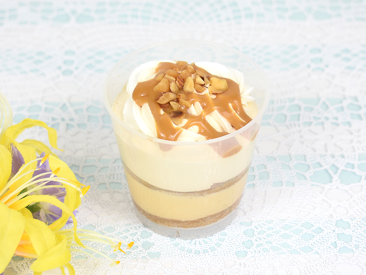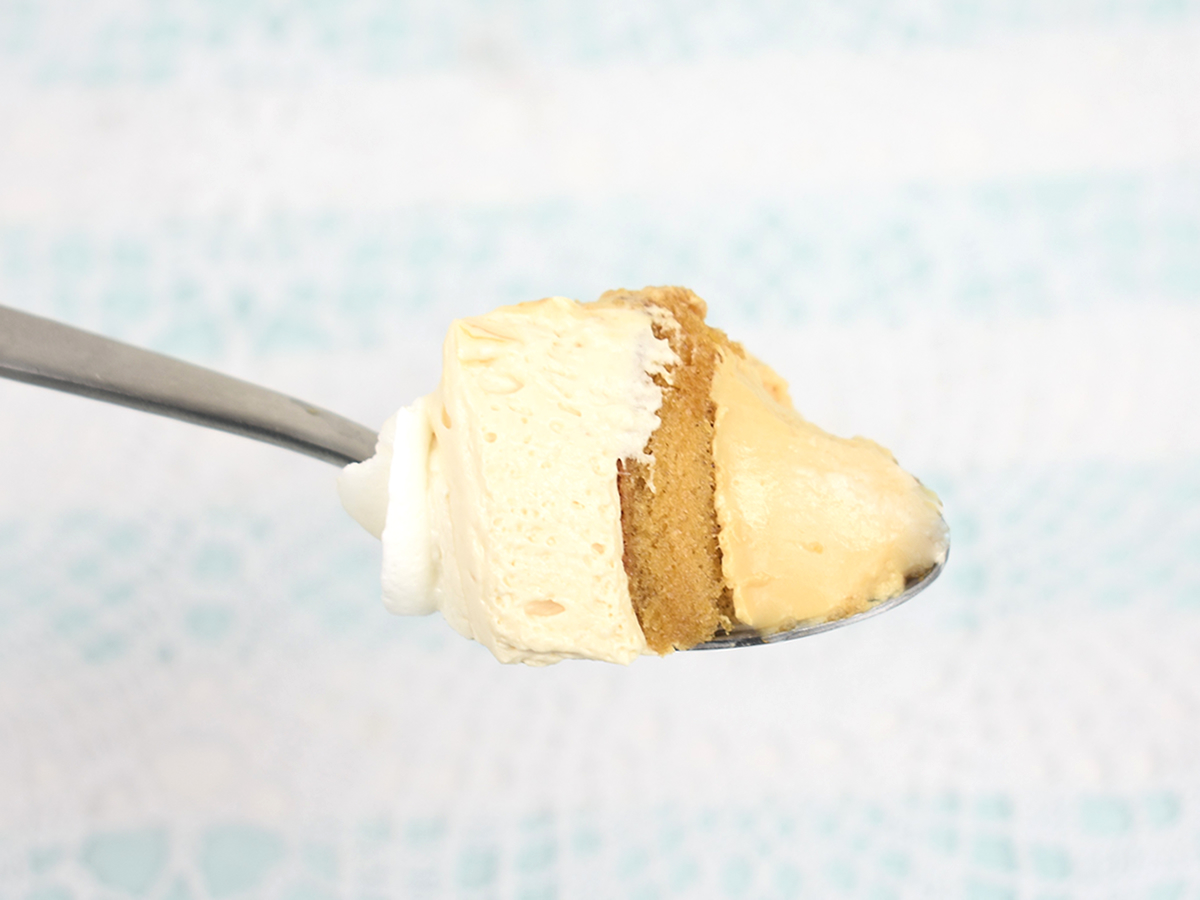 カップの底とキャラメルクリームの下に敷かれているのは、濃い茶色のカラメルスポンジ。カラメルのほろ苦い風味と、噛むとじゅわっと味が広がる“しみしみ”な食感を楽しめます。またカラメルスポンジにサンドされたキャラメルムースとも相性バツグン。ムースもコク深くて、ほんのり酸味を感じるビターな味わいに仕上がっています。