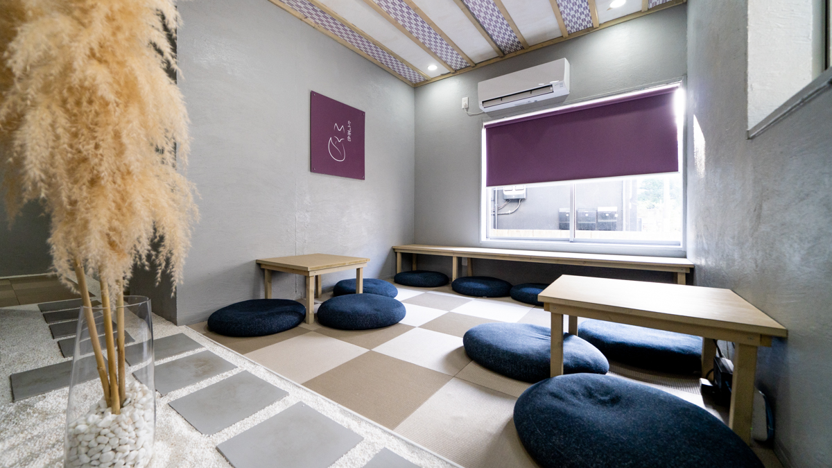扉を開けると、波紋が描かれた白い玉石が敷き詰められていて、まるで京都のお庭のよう。靴を脱ぎ畳のタイルのうえでゆったりくつろげる癒やしの空間になっています。和モダンな雰囲気のインテリアは、すべてアメリカ出身のオーナー、ジェームズ・ブラウンさんが手掛けたものです。