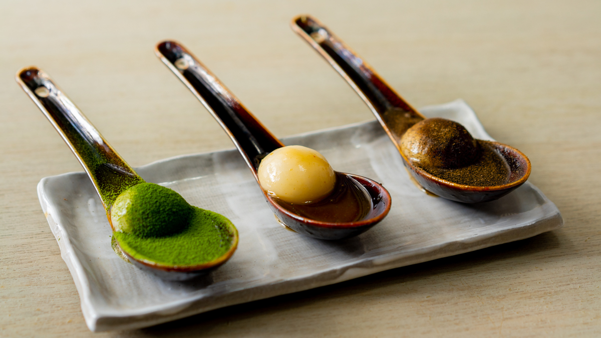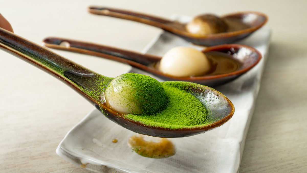 そのなかでも、京都で食べた味噌団子からインスピレーションを受けて開発したというのが人気メニュー「味噌団子」520円。300年以上の歴史を誇る京都の日本茶専門店、一保堂茶舗の茶葉を使用した「抹茶」と「ほうじ茶」、そして「水キャラメル」という3種類の味わいを食べ比べできるセットです。