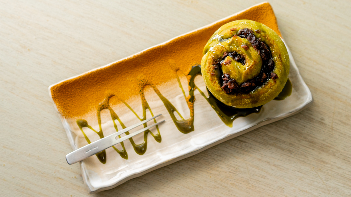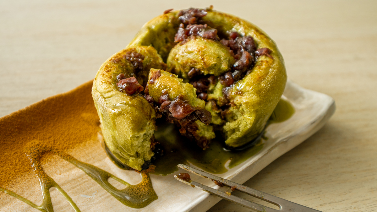 小麦粉、米粉、抹茶、ライスミルクなどを混ぜ合わせ発酵させた生地を、型に入れてオーブンで焼き上げたシンプルな焼き菓子ですが、ムッチリとしたベーグルにも似ている食感でなかなかの新感覚。北海道産の小豆を使用した自家製あんこ、蜜飴と抹茶の手作りソース、シナモンパウダーもたっぷりで贅沢な味わいです。乳製品や卵を使用しなくても、こんなにおいしいお菓子が作れちゃうんですね! 改めて日本文化の魅力を再認識させてくれるお菓子でした。