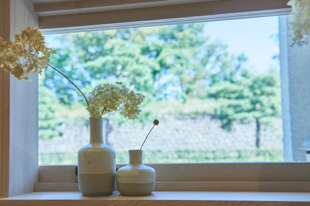 女性店主の手で清々しく整えられた店内。窓には二条城の緑が映ります。