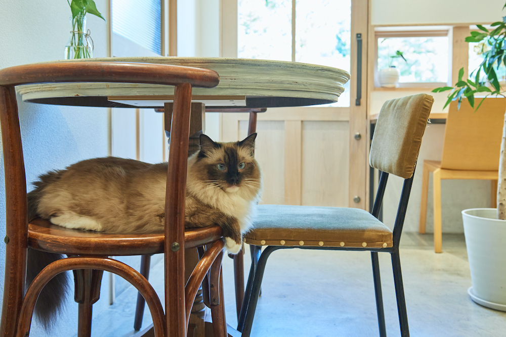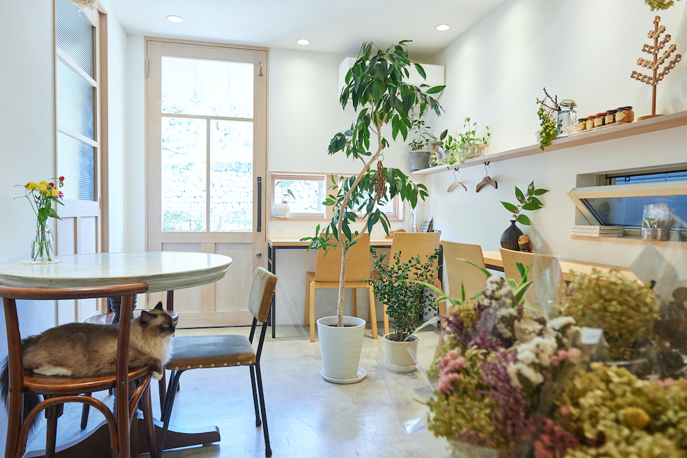 観葉植物と摘まれたばかりの草花、店内で販売もされているドライフラワーが白い壁に映える中、あれ?猫ちゃんが席に陣取っています。