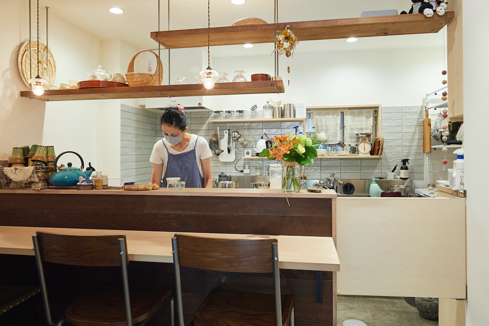 奥のカウンターで白玉スイーツを作る店主の大石さん。卵はダメ、ミルクも絶対ダメ、アレルギーで食べられるものが限られている大石さんが行けるカフェは限られていて、ならば自分で作って同じような人たちにも提供したいとオープンしたのが「泰風佳日」です。