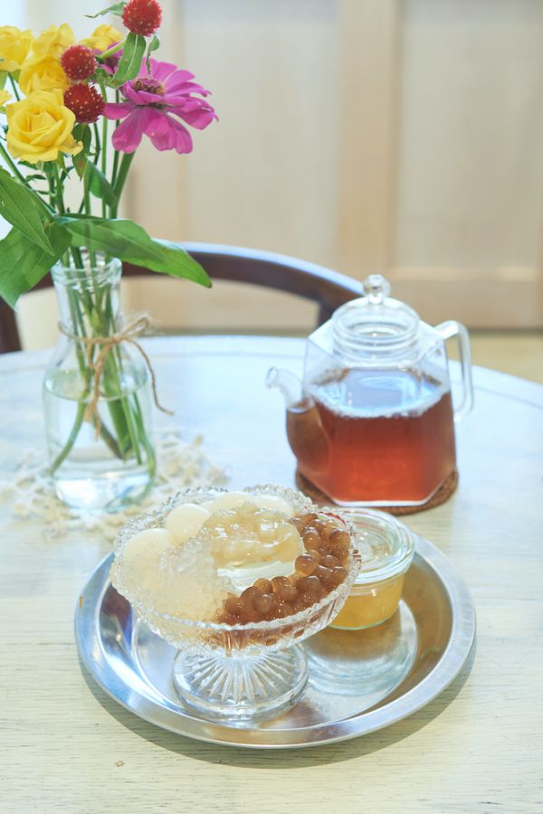グラスの中には白玉以外に台湾タピオカも大小2種類入って食感の違いが楽しく、あんこは小豆から炊き上げた自家製。自分で作るから、日持ちを気にしなくて大丈夫。ギリギリまで甘さを控えたやさしい甘さのあんこです。添えられたきなことシロップで味に変化をつけて、自分好みにいただきましょう。
