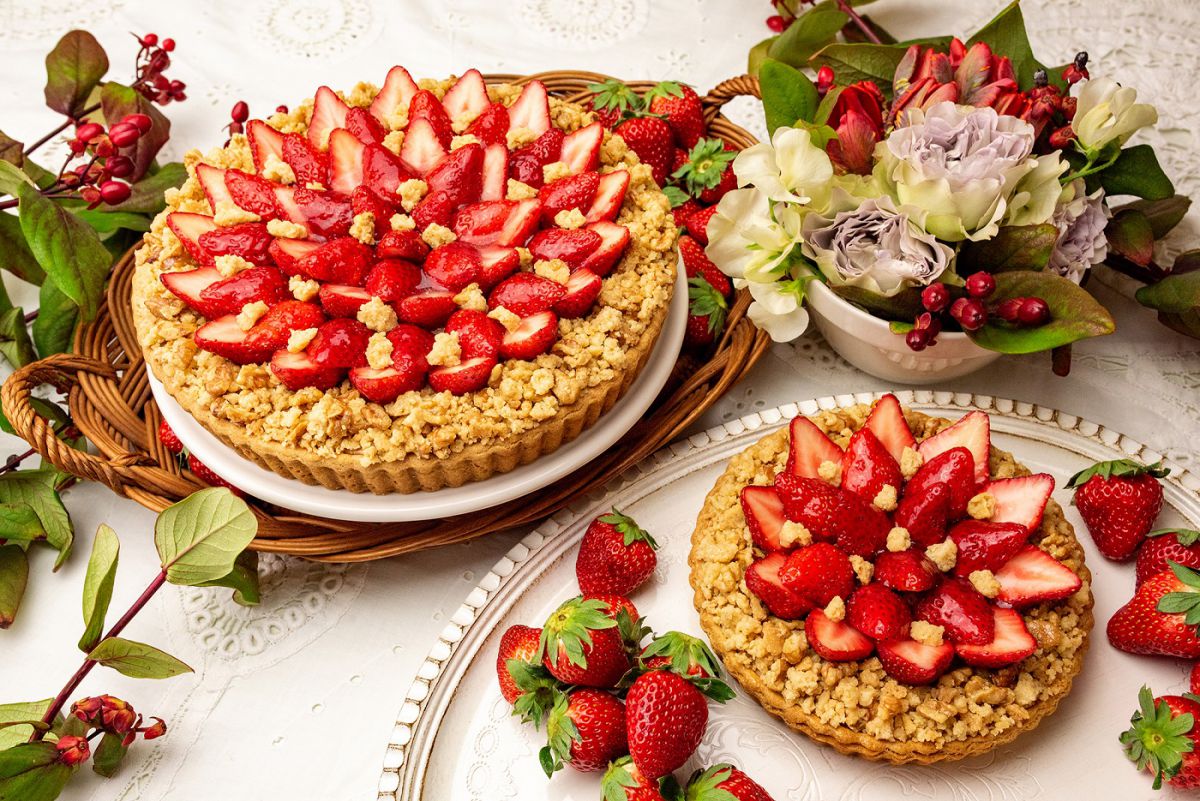 新作「静岡県産 “紅ほっぺ”とクルミクランブルのタルト~チョコレート風味~」は、2人はもちろん3~4人の少人数でシェアするのにもぴったりな17cmサイズのホールも登場。真っ赤なイチゴの華やかな見た目は贈り物にももちろん、自分へのご褒美スイーツとしてもおすすめです。