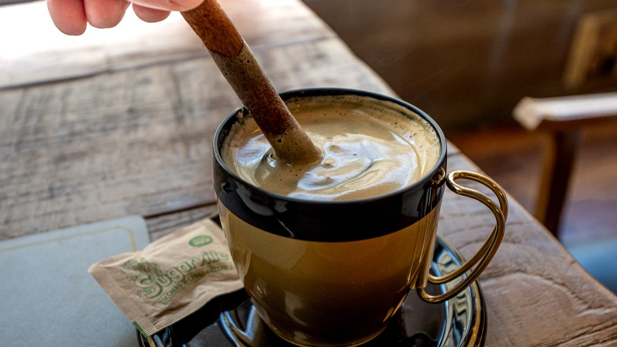 またペアリングとしてお好きなドリンク1杯を選べます。おすすめというのがシナモンコーヒー。シナモンスティックが1本丸ごと付いてくるだけあって、パンケーキに負けないほど力強い香りが楽しめますよ♪