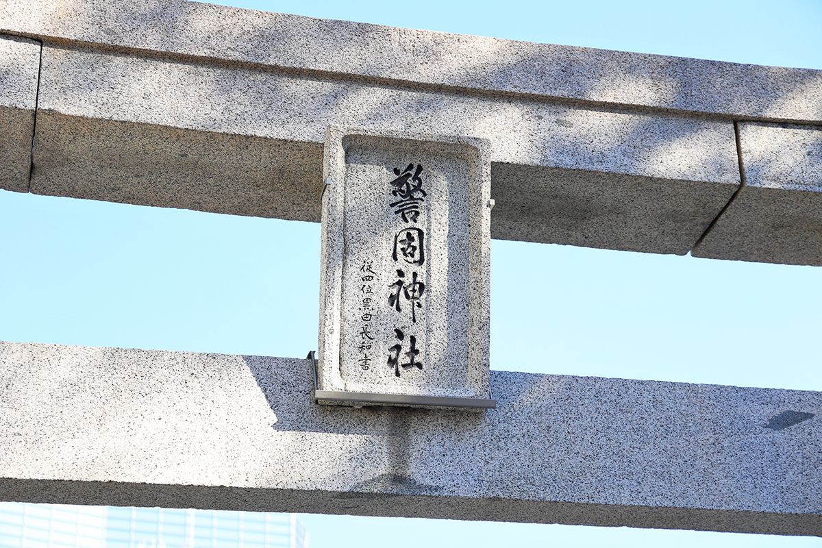 鳥居の扁額(へんがく)に刻まれた社名は、福岡藩12代藩主・黒田長知の筆によるもの。