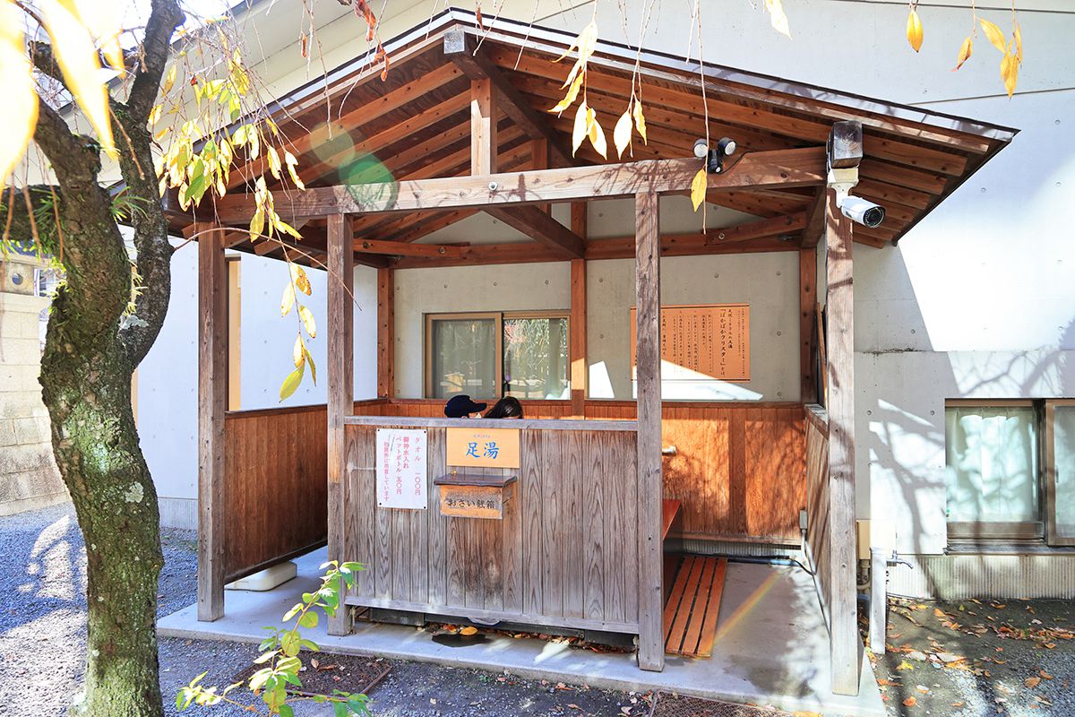 境内の一角には、誰でも無料で利用できる足湯が設置されています。足湯に使われている水は、良質の天然水を生み出す地層を再現した「ミネラルクリスター」という機器で生成されたもので、科学と信仰が融合したハイブリッドな御神水と同じものを利用しています。冷えた足を温めたり、街歩きで疲れた足を癒したり。参拝客がほっと一息つけるスポットとなっています。