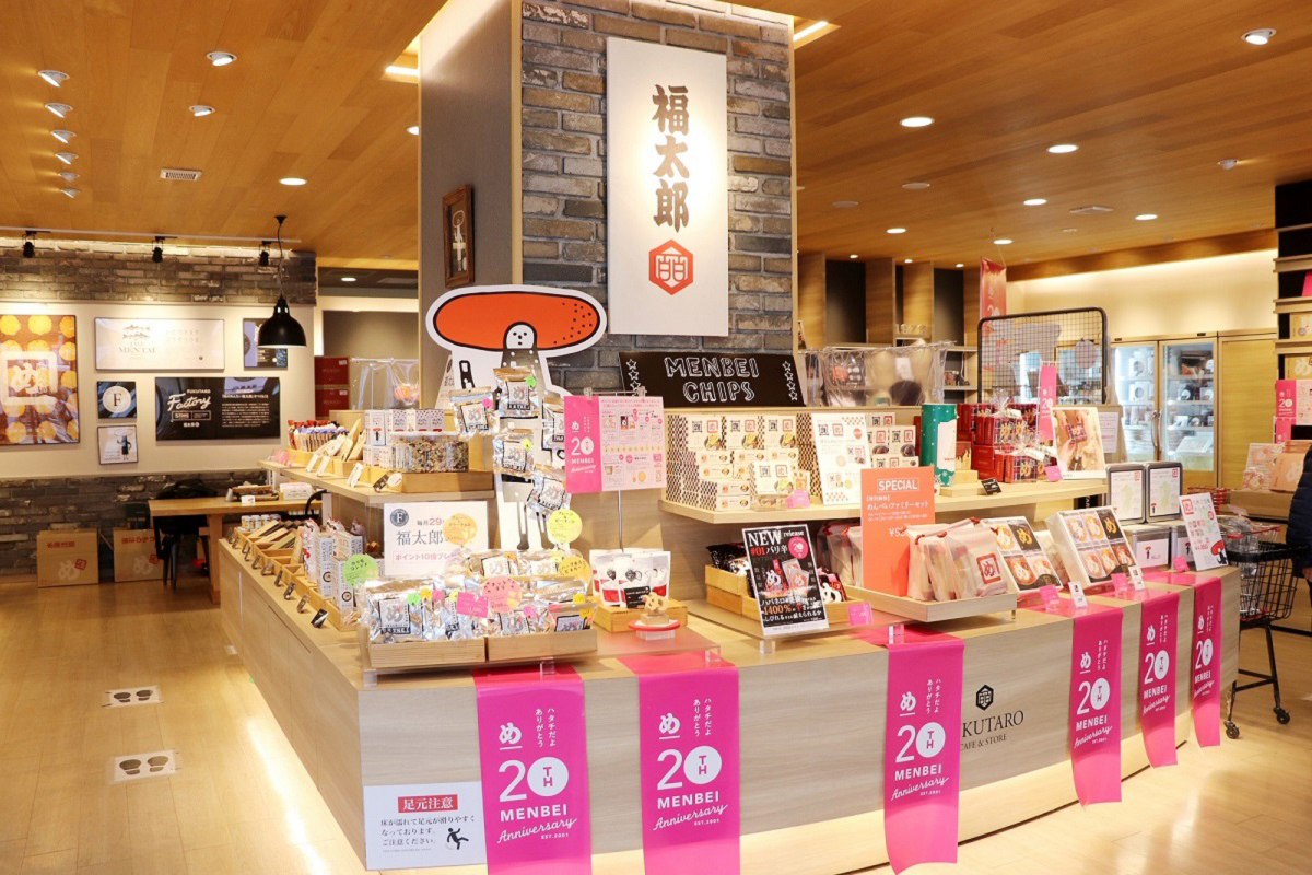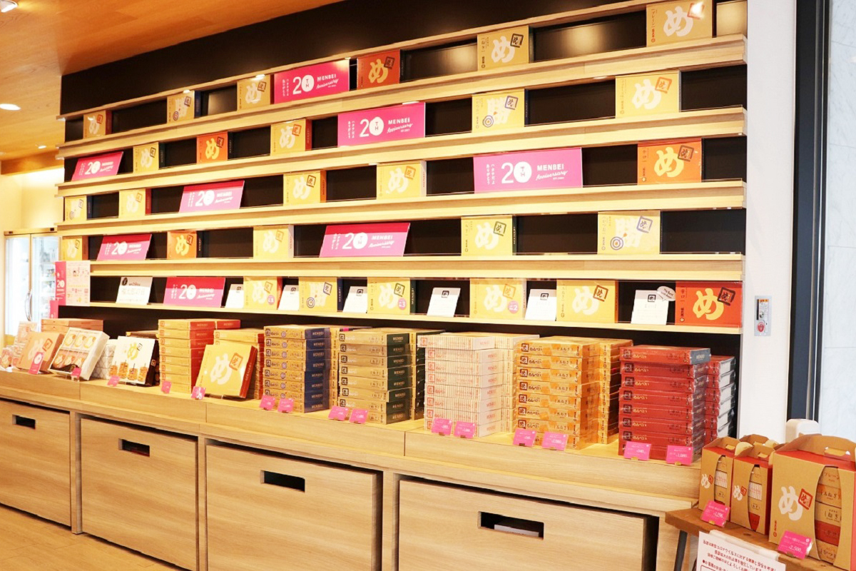 福岡みやげの定番で、2021年6月12日には誕生20周年を迎えた「めんべい」のコーナーも必見です。プレーン味はもちろん、九州の名産品や人気飲食店とのコラボ商品など、フレーバーは多種多彩。新商品も続々と誕生しており、来店のたびに新しい味と出合えます。