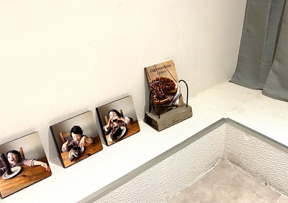 もうひとつ特徴的なのが、お菓子をテーマにした写真が貼り出されていること。実はこれ、お菓子のある日常や食べている情景を、写真にしたものなんです。店主でありパティシエである藤井さんは常々「お菓子作りを作業にしたくない」と考えてきたそう。