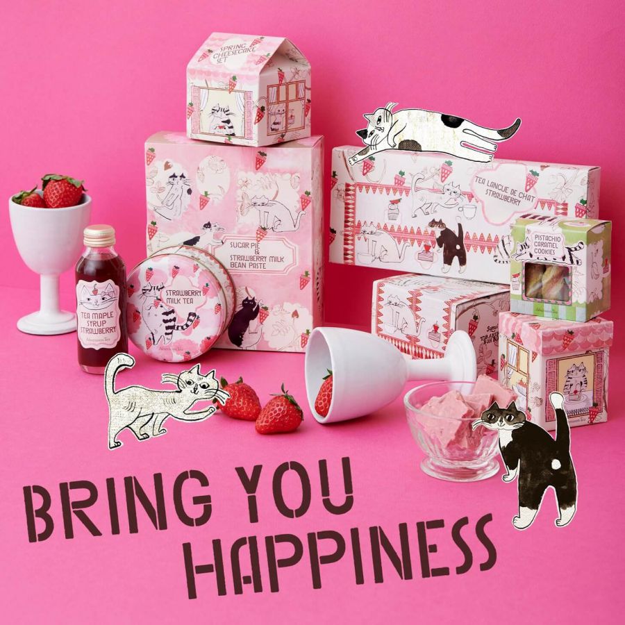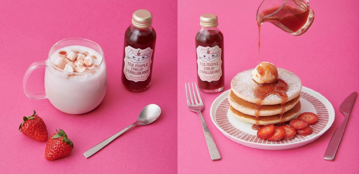 「アフタヌーンティー・ティールーム」から、イチゴの香り広がるフレーバーティーやイチゴのピューレにアールグレイを合わせたメープルシロップが販売中。「sunui×toranekobonbon」 がコラボしたイチゴとネコを描いたイラストの春限定パッケージで登場します。