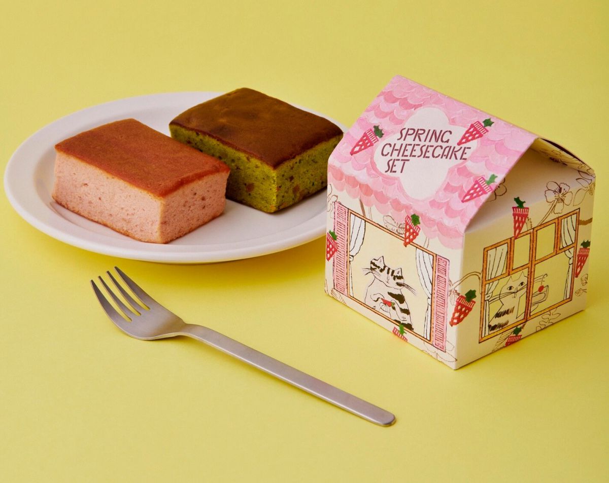 イチゴのチーズケーキと抹茶のチーズケーキ(各1個)の2つの味を詰め合わせた「春のチーズケーキセット」600円。大きな焼き型でしっとりと焼き上げたチーズケーキです。ピンク色のお家のようなパッケージに入っているのも素敵ですし、イチゴと抹茶の2種類楽しめるも嬉しいポイント!
