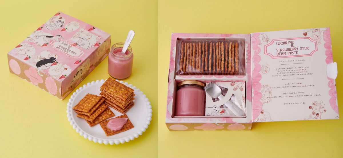 「シュガーパイ&いちごミルクあん」1600 円は、シンプルなパイにグラニュー糖をまぶして焼き上げた「シュガーパイ(18個)」と、白あんに牛乳、練乳、イチゴを加え、イチゴミルク風味に仕上げた春限定の「いちごミルクあん(150ℊ)」、オリジナルスプーンもセットでついてきます!さくさくのパイにあんペーストをのせたり、サンドしたり。作りたてのおいしさが楽しめますよ。