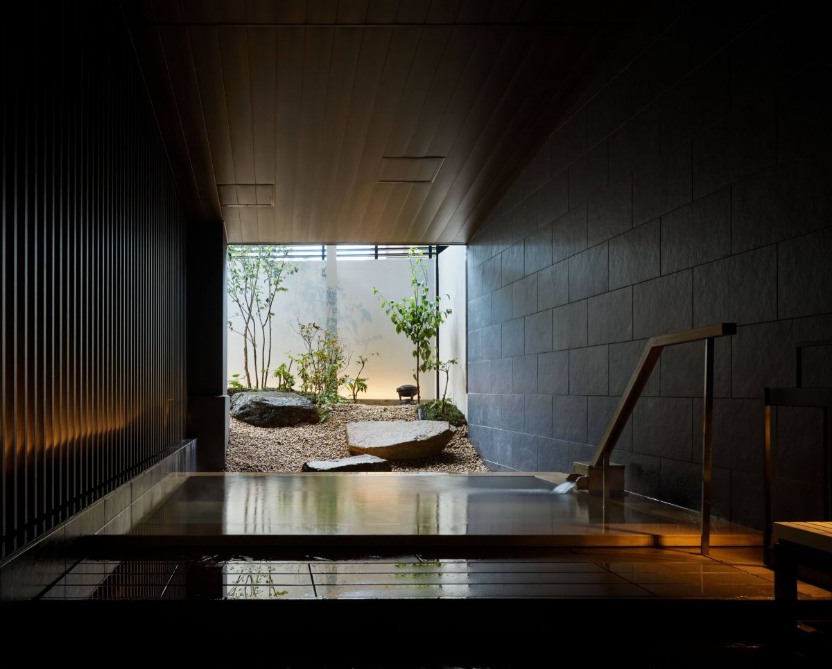 温泉に入ってまず感動するのが、この内湯の前に広がる中庭の光景!時間帯によっては、ここに日差しが差し込むこともあって、本当に美しいんです。お風呂のシックなデザインもとても好きで、細かいですが階段の手すりにいつも惚れ惚れしています(笑)。