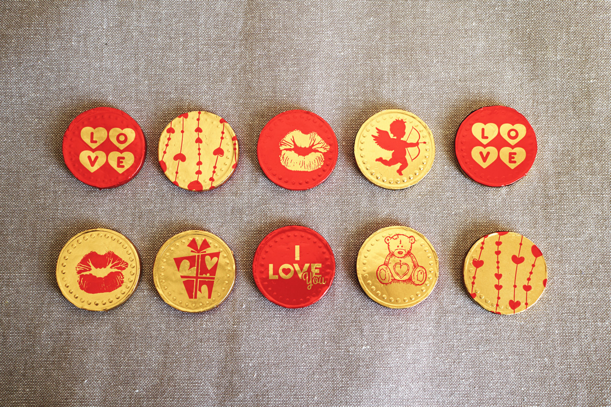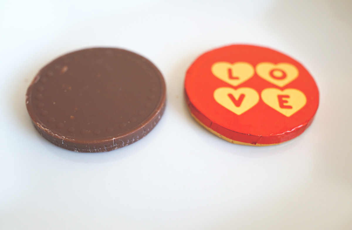 定番のコインチョコもバレンタイン仕様に!海外の硬貨をイメージしたデザインと形が定番のコインチョコですが、バレンタインのデザインが、1枚ずつでも配りたくなるキュートさなのでご紹介しますね。
