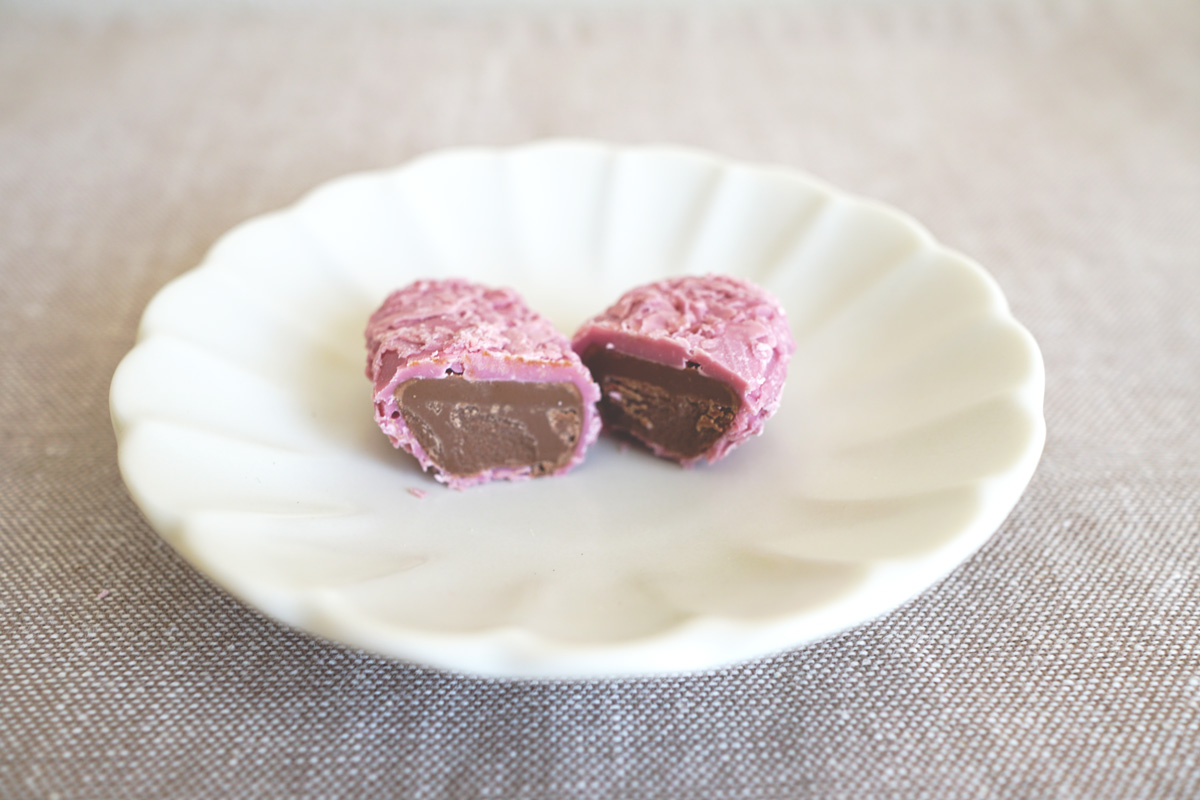 中にはくちどけなめらかなミルクチョコレートが入っています。ひとくち食べると、まずミルクチョコレートのカカオ感がしたあと、ほんのり甘酸っぱいルビーチョコレートの味が。爽やかなあとくちは上品で、ほっこり幸せになる味わいです。