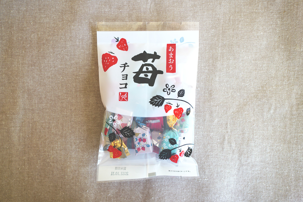 いちごのかわいいデザインが目を引く「あまおう苺チョコ」。袋のなかには50g(11粒ほど)のチョコレートが入っています。