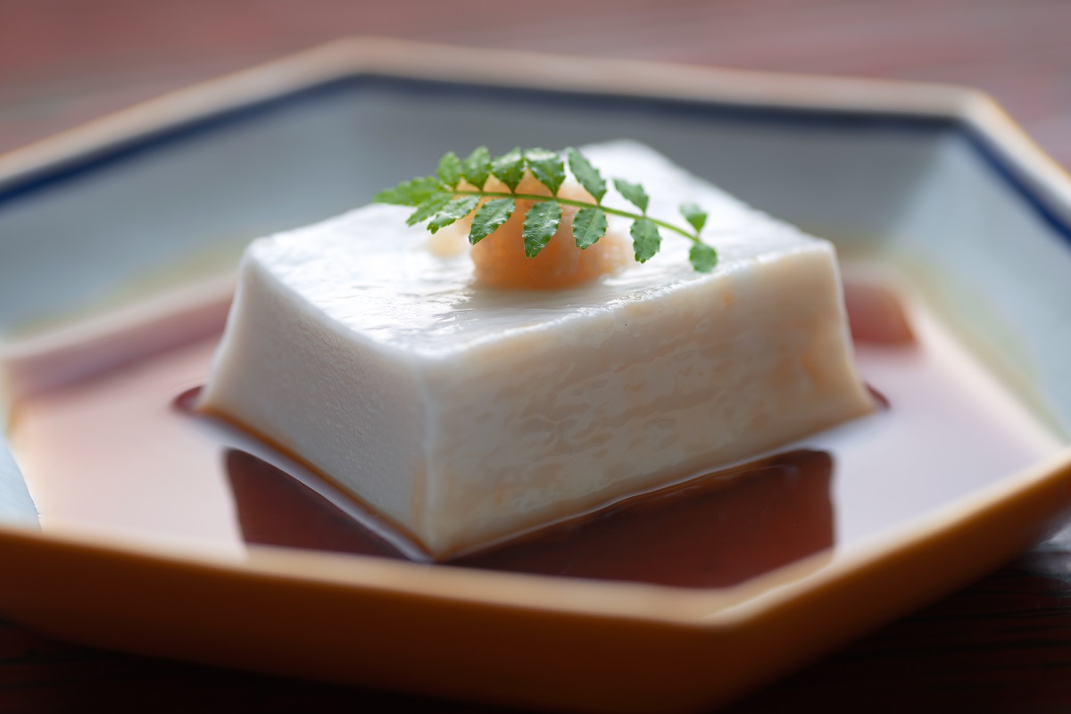 ふぐコースに付く前菜のごま豆腐は、秋篠宮さまのご要望で皇室の料理長に直伝したこともあるという店の名物。もっちりトロンとした食感が絶品です。