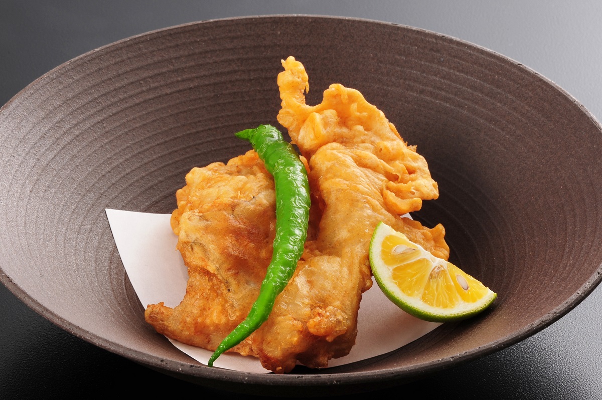 コースに付くフグの唐揚げは、サックリとした食感でうまみがたっぷり。風味付けに大分名産のカボスをしぼって召しあがれ。