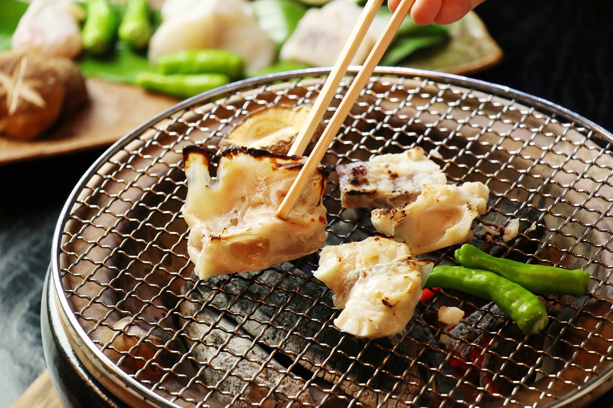 夏のコースに付く名物の焼きフグは、醤油風味のタレを付けたフグの身を七輪で香ばしく焼いたもの。立ち上る芳醇な香りが食欲を刺激する逸品です。