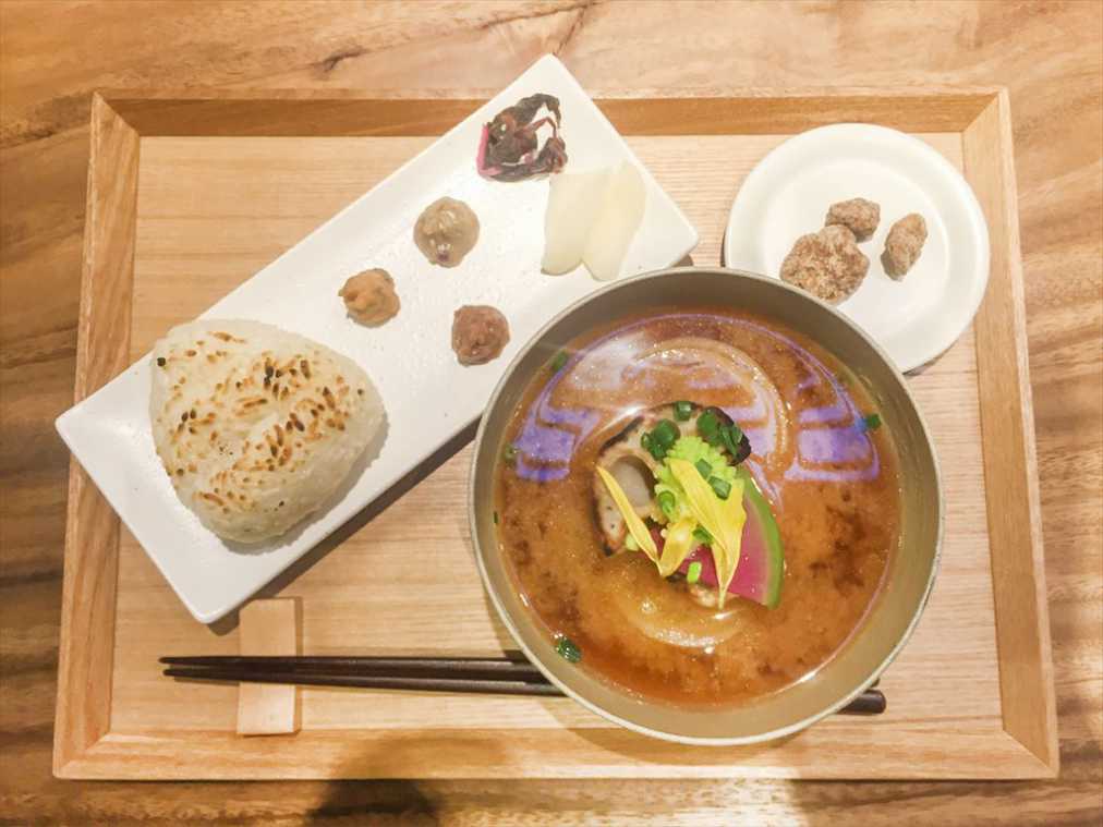 こちらは、具だくさんの「味苑みそ汁」と「焼おむすびと3種のおかず味噌」。味噌汁には濃厚な「蔵魂(ぞっこん)味噌」と甘口の「麦南洋味噌」をブレンド、具材には大根と焼き鮭、紅芯大根とロマネスコを選びました。焼きおむすびに付くおかず味噌は日替わり。この日は鮭味噌、鴨ねぎ味噌、チーズとマッシュルームの味噌の3種でした。具材と合わせることで、いっそう味噌の味わいが感じられます。