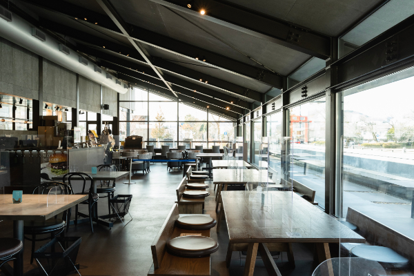 印象的な外観が一際目を引きますが、そのデザインや色調は、周囲の景観と見事に融合しています。中に入ると広々とした空間が広がり、大きな窓一面に浅間大社を眺む最高のロケーション。