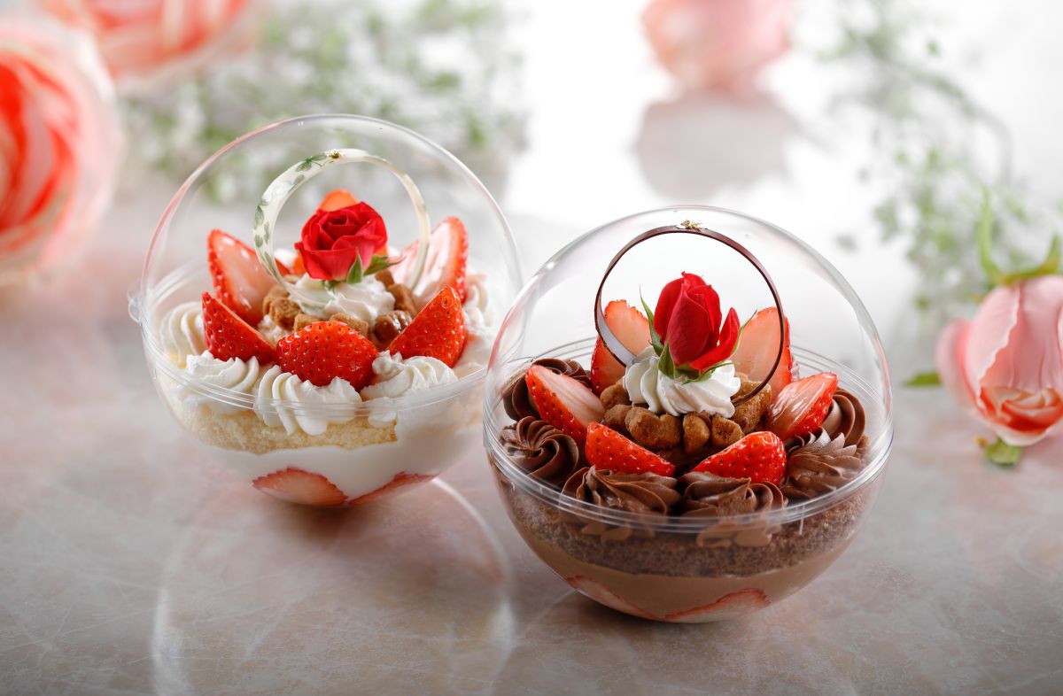 透明のカプセルの中にバラの香りをまとわせたいちごのコンポート、チョコレートクリームとスポンジをイン、アーモンドクッキーやいちごなどをトッピングした「スイーツ スフィア」。