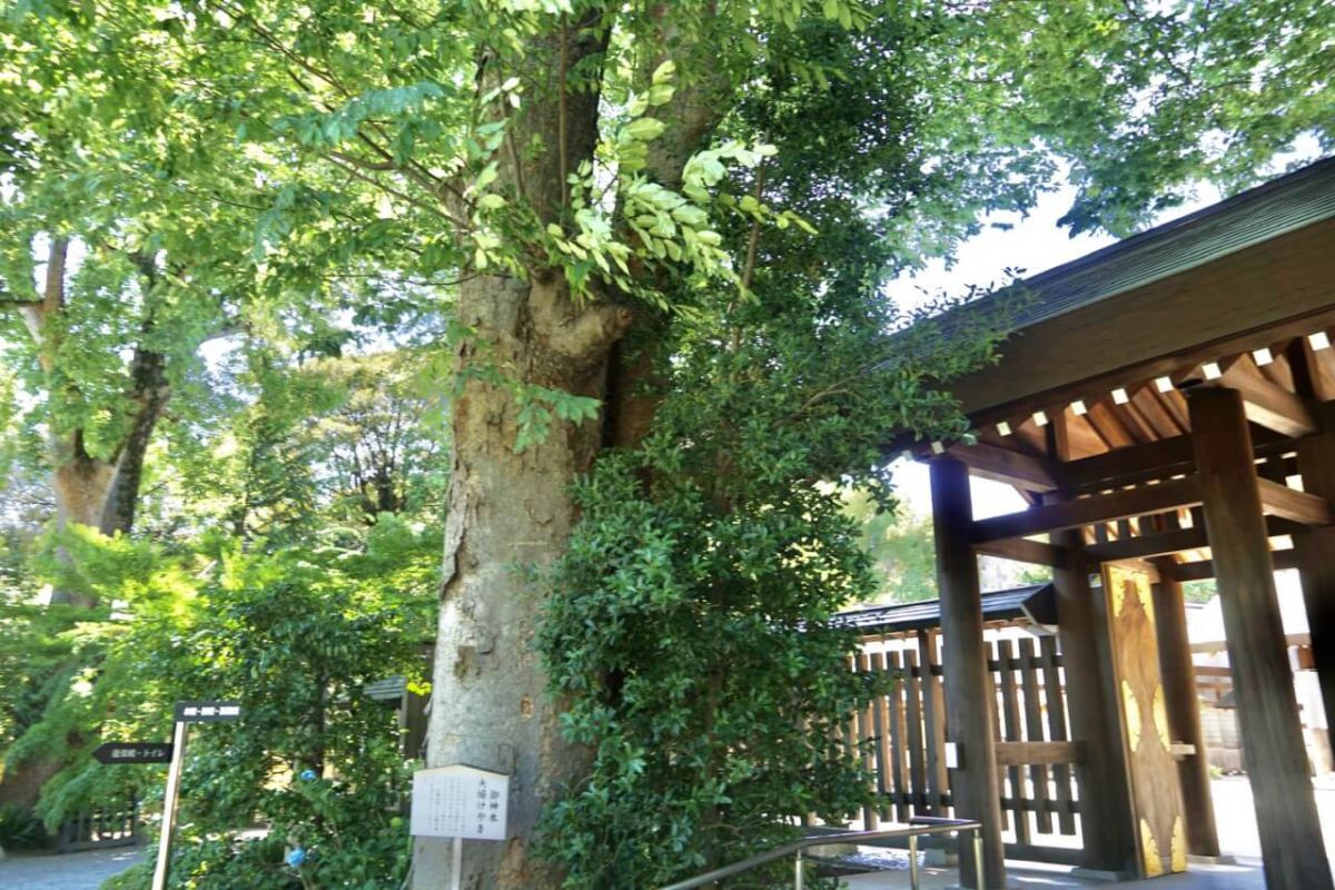 参道には立派な御神木が。もともとは2本の木だったそうですが、長い月日を経て1本の大樹に。木々が寄り添う姿から、「夫婦けやき」とよばれています。