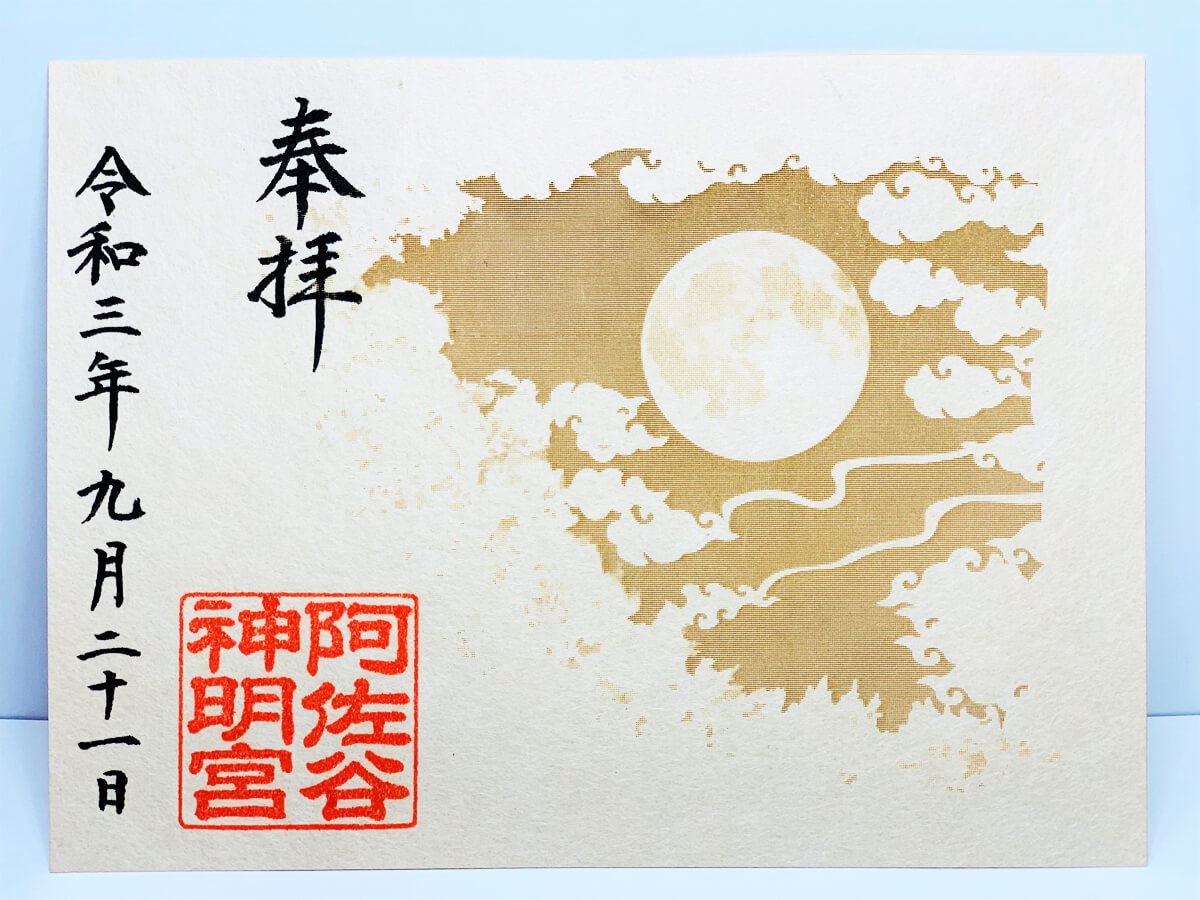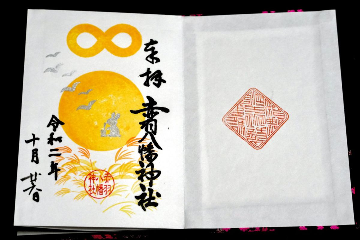 無限大のマークは「下元八運御守」といい、古代中国の風水思想によるもの。八幡の八と八運をかけ合わせたマークです。こちらは10月に授与され、お月見をデザインした御朱印となっています。