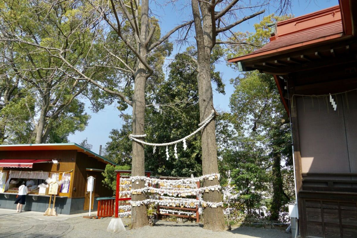 境内にある御神木は「夫婦銀杏」とよばれ、夫婦和合や家庭円満のご利益があります。また、参道の脇には丸い形の2つの石が並んだ子宝石があり、安産の神、子育ての神として信仰されています。