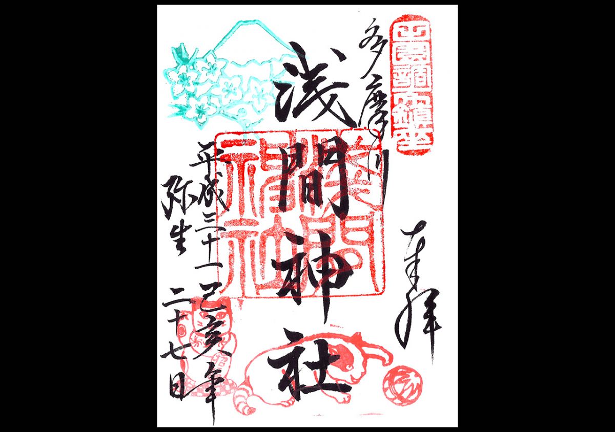 「浅間神社」の朱印と田園調布鎮座の印、そして墨書きで「多摩川浅間神社」とあります。