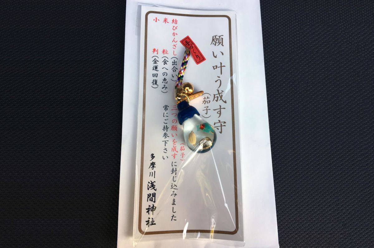 透明なナスをモチーフにしたキュートなお守りには、結びかんざし、小判、米粒が入っています。