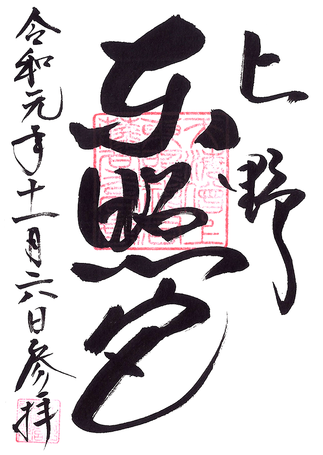 こちらが基本的な御朱印。崩し字で「上野東照宮」と書かれています。朱印には「藤堂高虎 東照神君 天海僧正」とあり、東照宮神君(徳川家康)に仕えていた藤堂高虎、天海僧正の3人の名前が残されています。