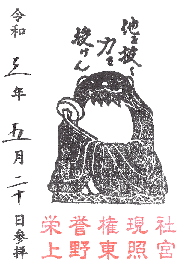 「上野東照宮」のなかで、強運パワースポットとして親しまれているのが「栄誉権現社(えいよごんげんしゃ)」。『松山騒動八百八狸物語』に登場する怪談・講談の四国八百八狸の総帥の刑部狸(ぎょうぶたぬき)を祭り、「お狸様」ともよばれています。「他を抜く力を授けん」と記された「他抜御朱印」で、こちらは通年で授与されています。